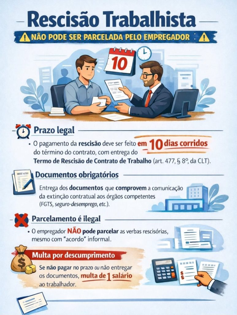 A rescisão do contrato de trabalho é um momento que exige atenção rigorosa às normas da Consolidação das Leis do Trabalho (CLT). O descumprimento dos prazos legais ou a tentativa de parcelamento das verbas rescisórias configura irregularidade e pode gerar multa ao empregador.